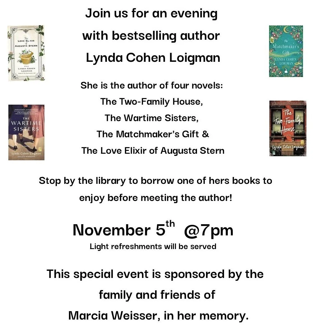 The East Williston Library invites readers for a special evening with bestselling author Lynda Cohen Loigman on Tuesday, November 5th at 7 p.m. Loigman is the author of four acclaimed novels — The Two-Family House, The Wartime Sisters, The Matchmaker’s Gift, and her newest release, The Love Elixir of Augusta Stern.