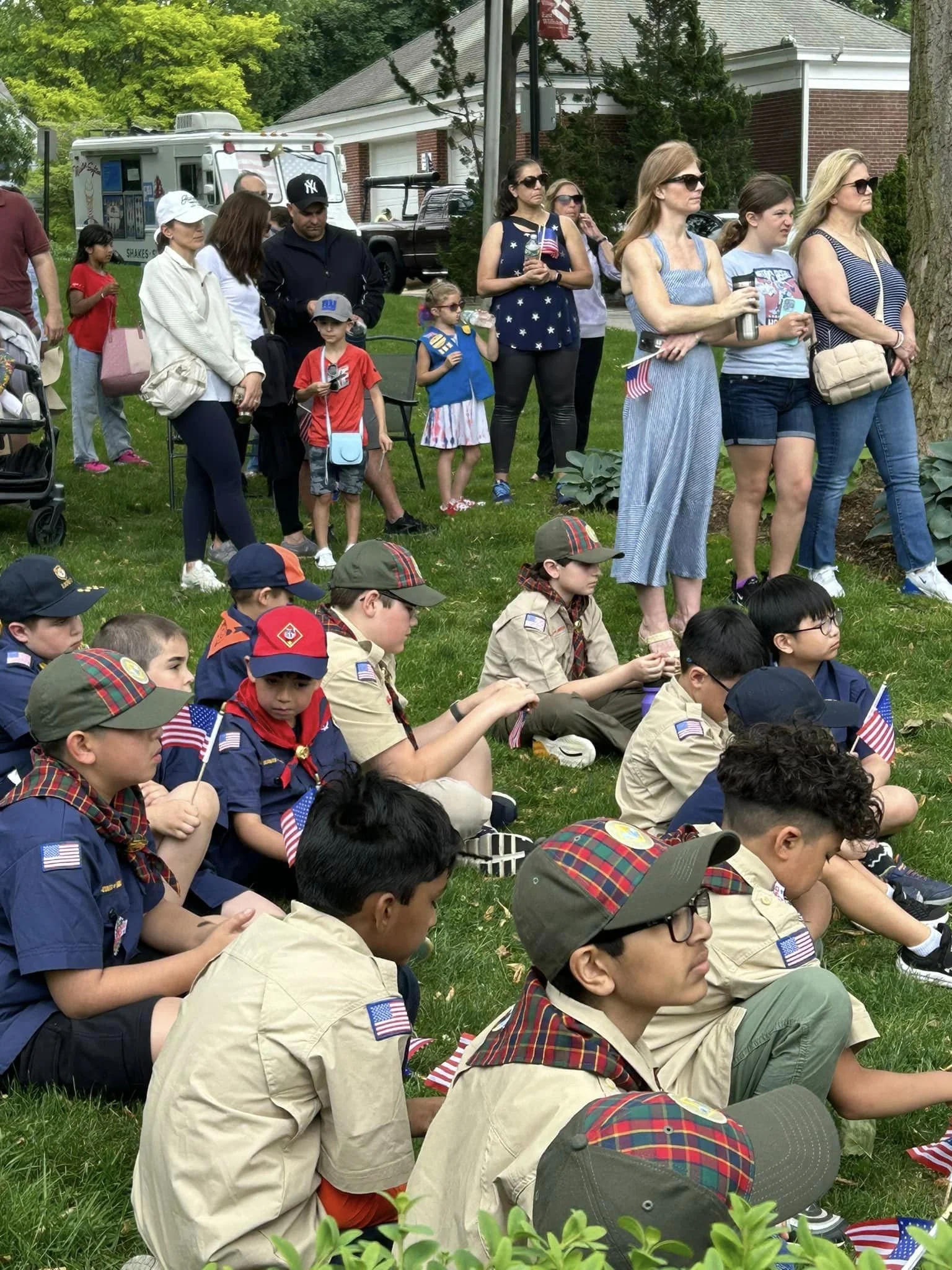 The Village Green, adorned with flags and floral arrangements, provided a serene backdrop for the community to come together in reflection and gratitude.