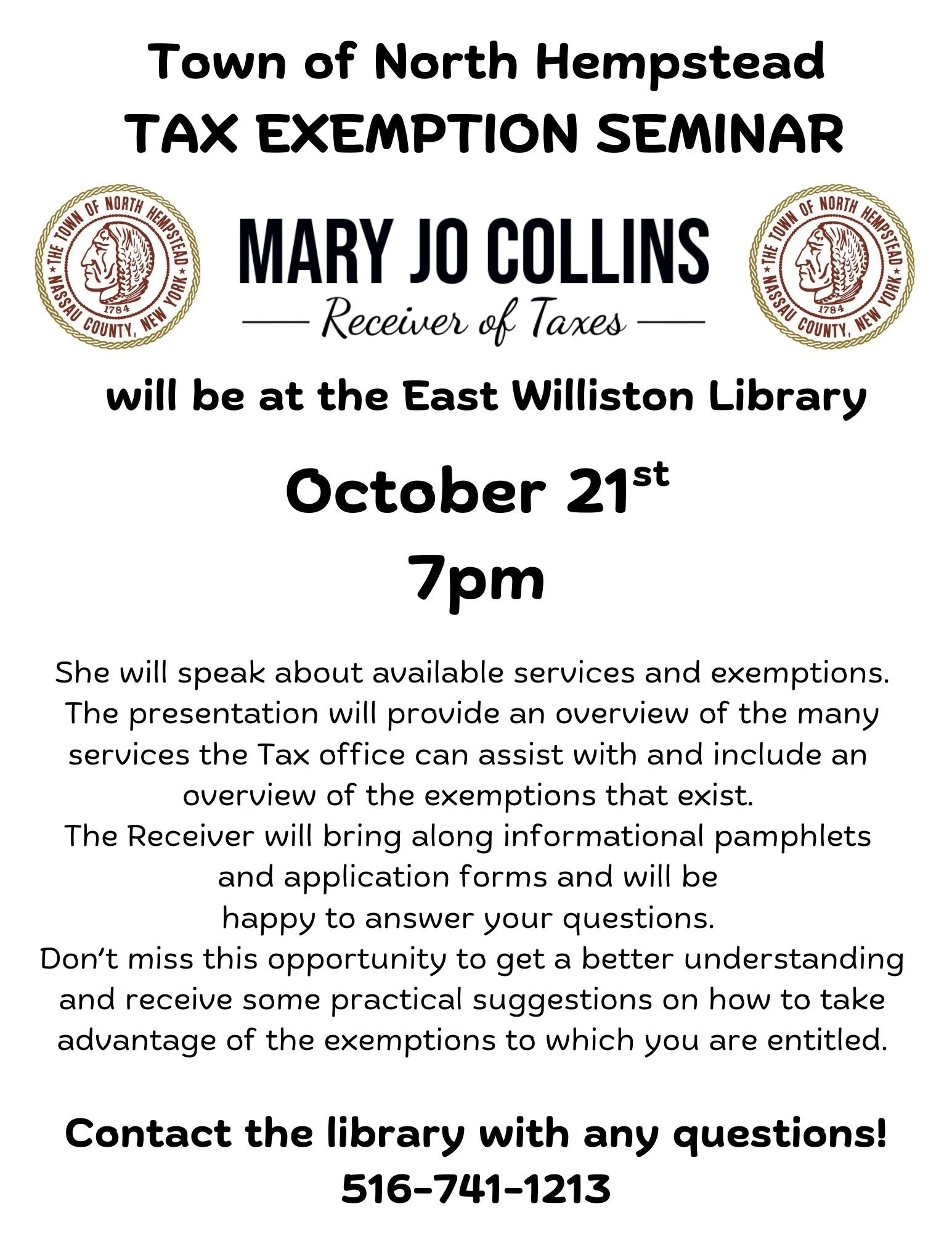 Town of North Hempstead Tax Exemption Seminar at the East Williston Public Library on October 21st, 2025 at 7pm. Contact the library with any questions!